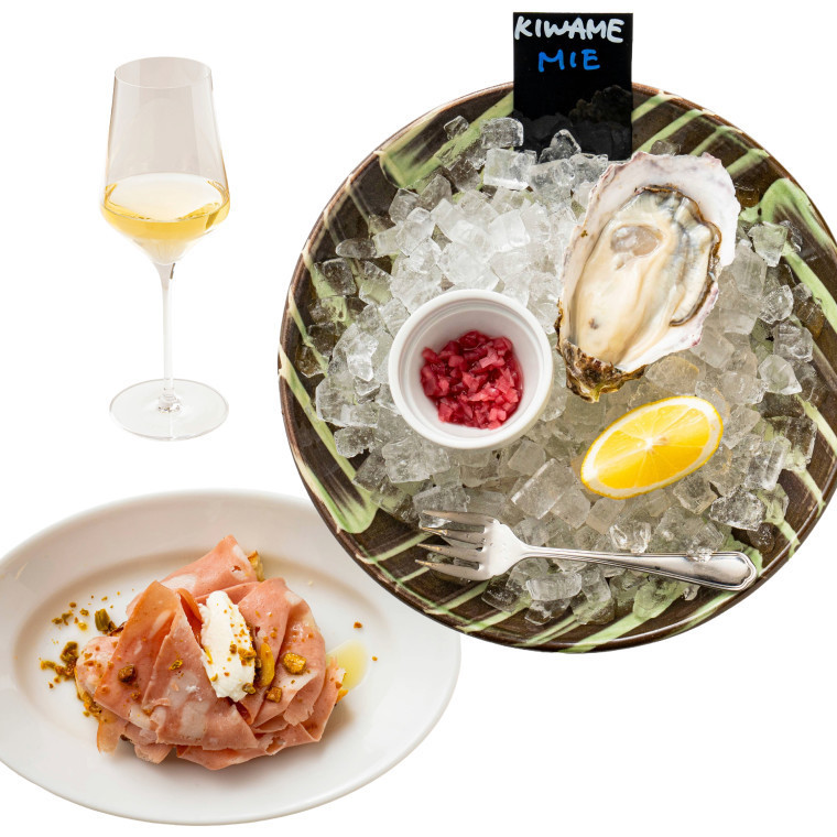 ※ドリンクは生ビール・スーパードライM・ハイボール・グラスワイン (泡・白・ロゼ・赤)・コーラ・サイダー・オレンジ・アップル・ウーロン茶からお選びいただけます。※別途チャージ代440円をいただきます。ドリンクに大粒の生牡蠣とチケッティがセットになったオトクなセット。