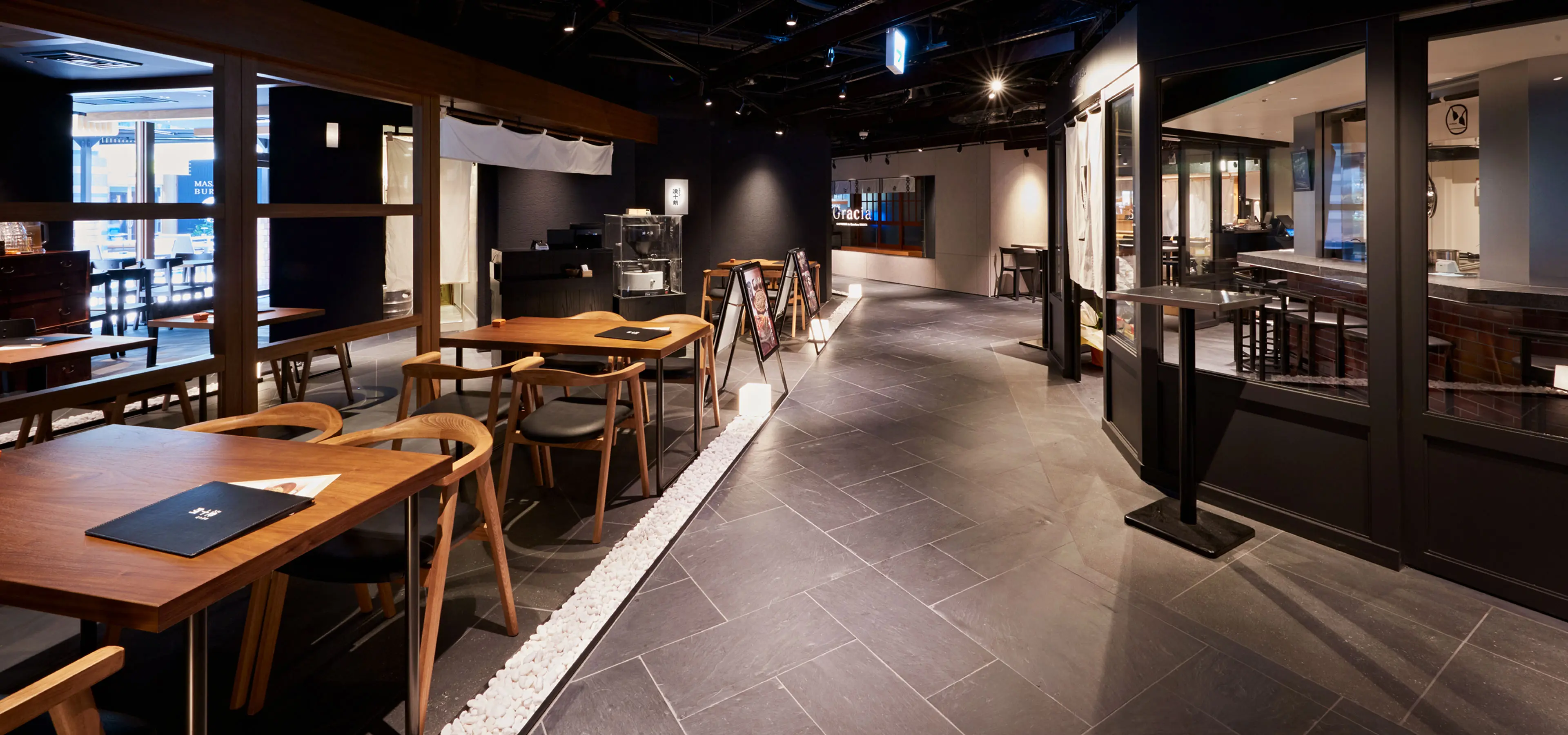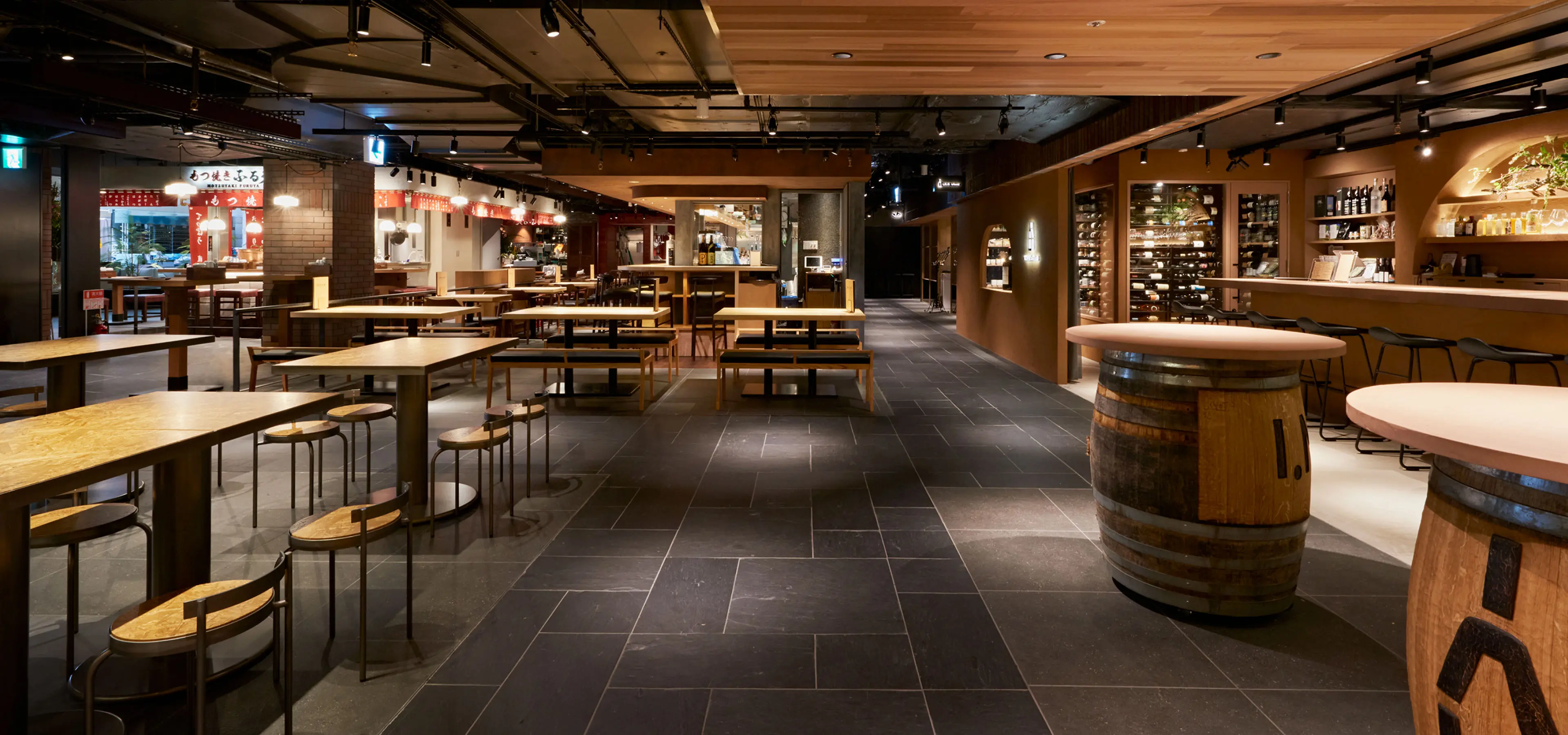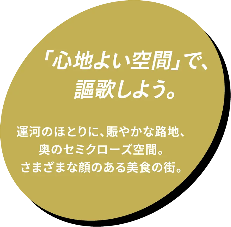 奥のセミクローズのお店で、自分だけの時間を過ごしたり。賑やかなオープンスペースのお店で、みんなで料理を囲んだり。一人でも、みんなでも、特別な時間が楽しめます。