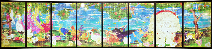 ビデオアートという芸術ジャンルを確立した世界的アーティスト、ナムジュン・パイクの作品がアトリウムであるクリスタルキャニオン南側のガラス壁面に設置されています。 縦10台、横18台、合計180台ものテレビモニターが整然と並び、高尚なイメージから通俗的なイメージまた西洋的文脈やアジア的風景など、パイクが抽出した多彩なイメージの断片がめまぐるしく画面上を錯綜し、さながら情報のカオスのようです。タイトルは「Fuku/Luck,Fuku=Luck,Matrix」。パイクの作品としては日本最大級の作品です。